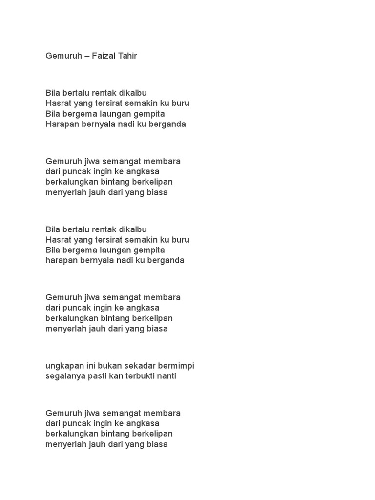 Lirik Lagu Faizal Tahir Gemuruh. Bila bertalu rentak dikalbu Hasrat yang tersirat semakin kuburu Bila bergema laungan gempita Harapan bernyala nadiku berganda Gemuruh jiwa semangat membara. Gemuruh jiwa semangat membara Dari puncak ingin ke angkasa.